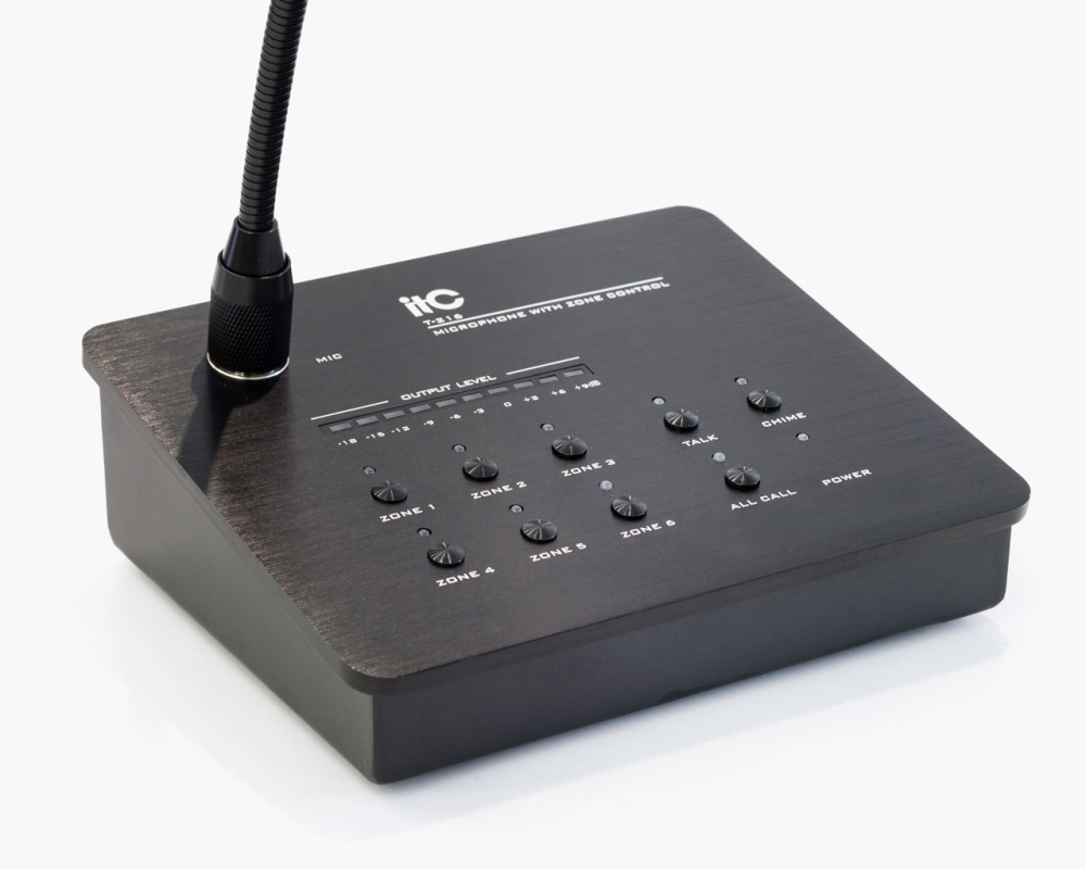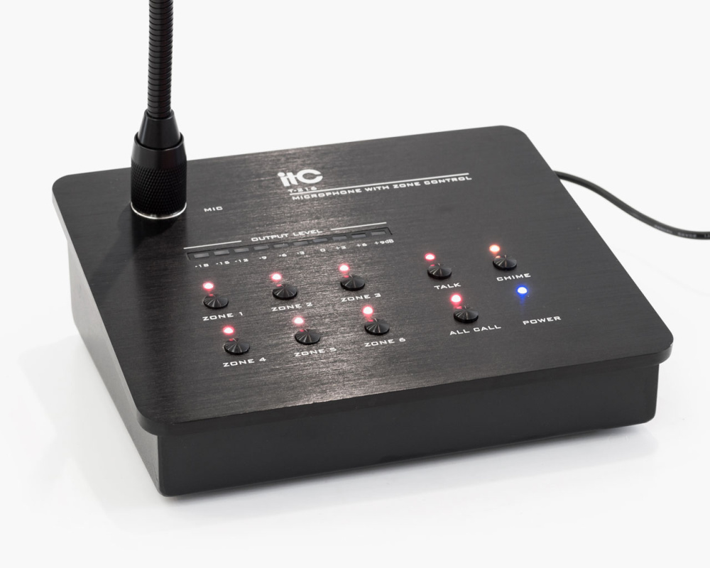 ITC Audio T-216 — современный шестизонный настольный пейджинговый микрофон, созданный для оперативного и качественного управления объявлениями в системах громкой связи. Устройство позволяет быстро выбрать одну зону, несколько или все сразу, а также использовать встроенный звонок с выбором из двух или четырёх тонов. Благодаря удобному сенсорному управлению и функции автоматического приоритета микрофон значительно упрощает ежедневную работу администраторов и диспетчеров.