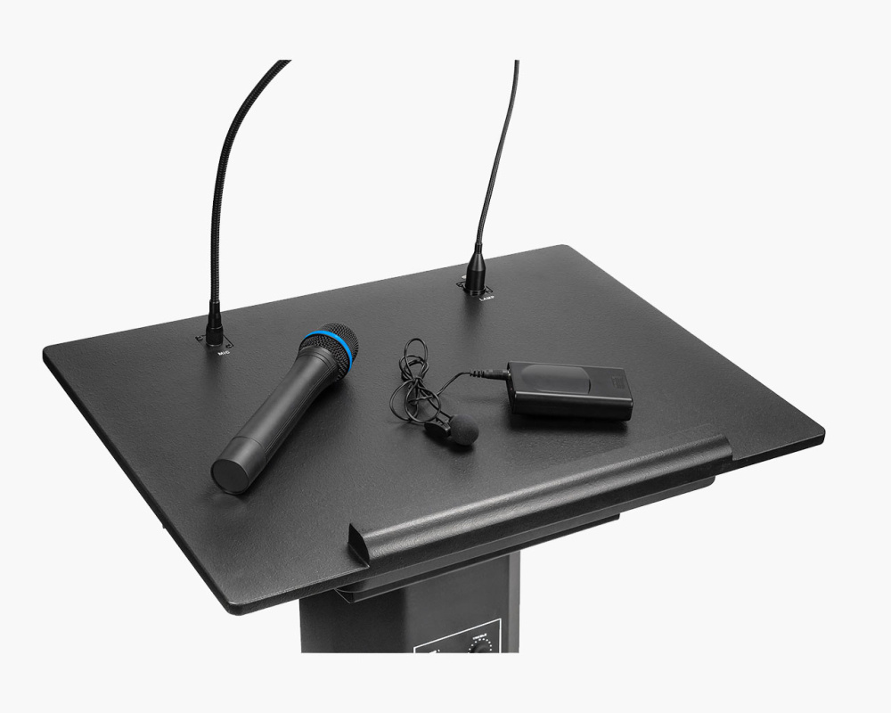 ITC Audio T-6236B — современная мобильная трибуна с встроенным усилителем 60 Вт и комплектом из двух беспроводных VHF микрофонов, предназначенная для проведения лекций, презентаций и конференций. Модель сочетает удобную рабочую поверхность, качественную акустику и практичные дополнения — гибкий микрофон на гусиной шее и настольную лампу. Всё необходимое для выступления находится в одной мобильной конструкции, что значительно упрощает подготовку к мероприятию.