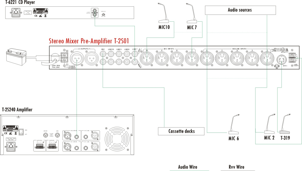 Устройство позволяет гибко комбинировать источники звука, включая возможность автоматического переключения на голосовую активность и управление звонком через дистанционный микрофон T-319. Предусилитель обеспечивает стабильное качество сигнала и возможность записи выхода. ITC Audio T-2S01 — надёжное решение для систем, где требуется сложная коммутация, приоритет голоса и поддержка аварийных функций.