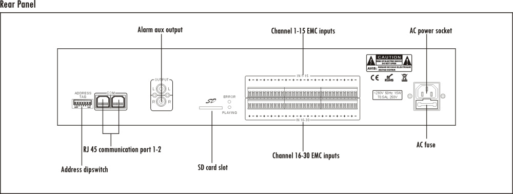 Данный блок осуществляет прием сигнала в виде “сухого контакта” от пожарной станции или других устройств. При подаче сухого контакта на разъемы задней панели, запускается цифровое сообщение, записанное на SD-карту. На карте может быть записано до 300 сообщений. В зависимости от номера сухого контакта, запускается цифровое сообщение с соответствующим номером.