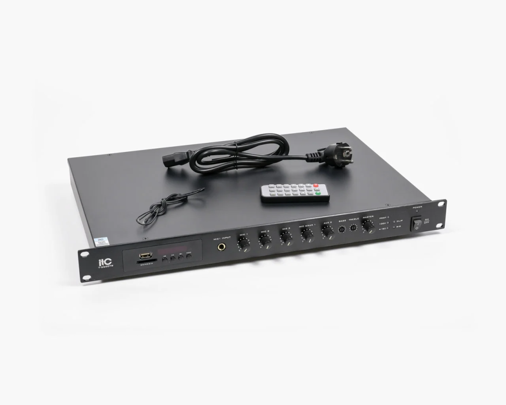 ITC Audio T-500DTB – высокомощный усилитель класса D с выходной мощностью 500 Вт, разработанный для аудиосистем и оповещений в просторных помещениях. Устройство поддерживает воспроизведение через MP3, тюнер и Bluetooth 5.0, используя USB, TF-карты или беспроводные источники. Корпус в стойке 1U сочетает практичность и современный дизайн, идеально подходя для профессиональных решений. Регулировка низких и высоких частот обеспечивает точную настройку звука под любые задачи.